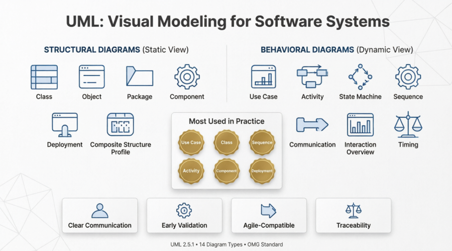 Originally developed in the mid-1990s by Grady Booch, James Rumbaugh, and Ivar Jacobson (the “Three Amigos”), UML unified several popular object-oriented modeling methods of that era. It was later adopted and standardized by the Object Management Group (OMG). The current version, UML 2.5.1, defines 14 types of diagrams that together offer both structural (static) and behavioral (dynamic) perspectives of a software system.