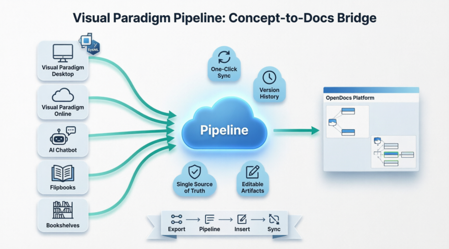Enter the Visual Paradigm Pipeline: a cloud-based integration that acts as a “knowledge hub,” bridging professional modeling tools like Visual Paradigm Desktop and Visual Paradigm Online directly with OpenDocs, an AI-powered documentation platform.  This guide explores how the Pipeline serves as the essential connective tissue of Visual Paradigm’s AI Visual Modeling Ecosystem, enabling seamless, living documentation that evolves alongside your projects.