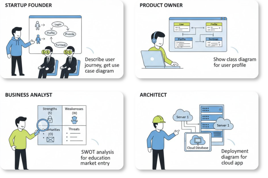 Em uma era em quegeradores de diagramas de IAinundam o mercado com saídas rápidas e visualmente atraentes, a maioria das ferramentas permanece limitada à produção de imagens estáticas de uma única tentativa — belas imagens que carecem de profundidade, editabilidade ou aderência a padrões profissionais.Visual Paradigmse destaca ao transformar a IA em um verdadeiropotência de modelagem. Seusrecursos de IAcriam modelos dinâmicos, semanticamente ricos e totalmente editáveis fundamentados em padrões da indústria comoUML, SysML, ArchiMate,C4, BPMN, e muito mais.
