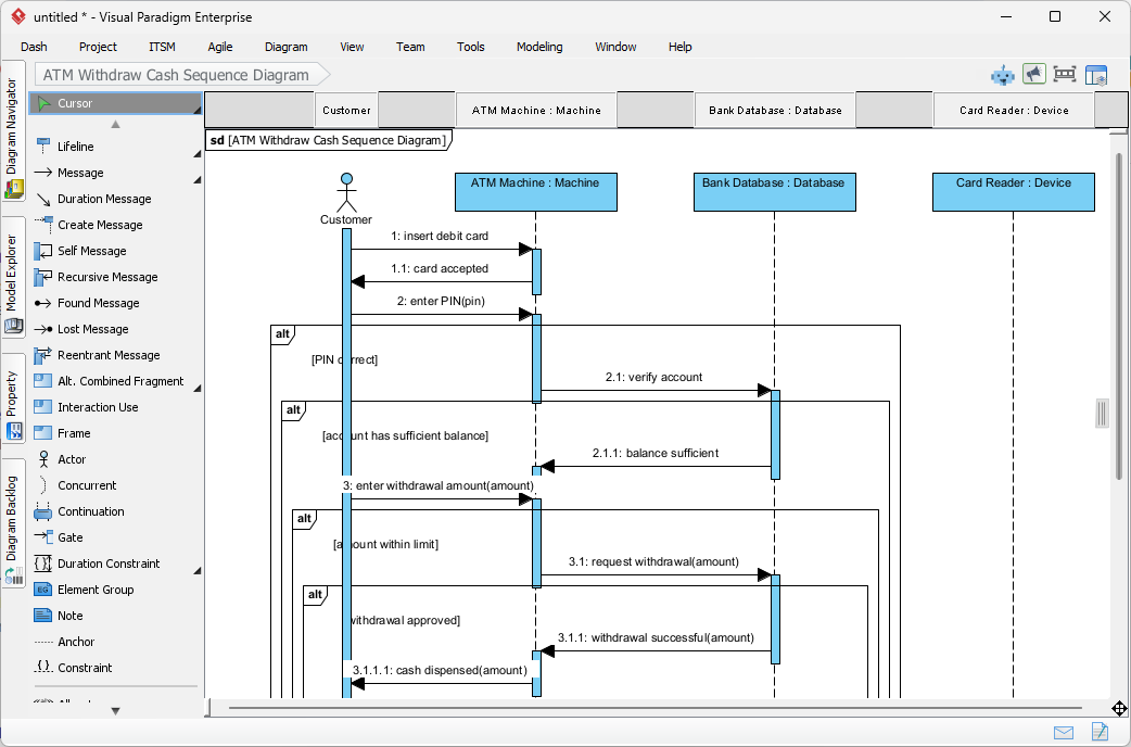 • Use Combined Fragments: Employ UML combined fragments (e.g., alt, opt, loop) to model alternatives, optional flows, and repetitions at any level, enhancing diagram expressiveness.